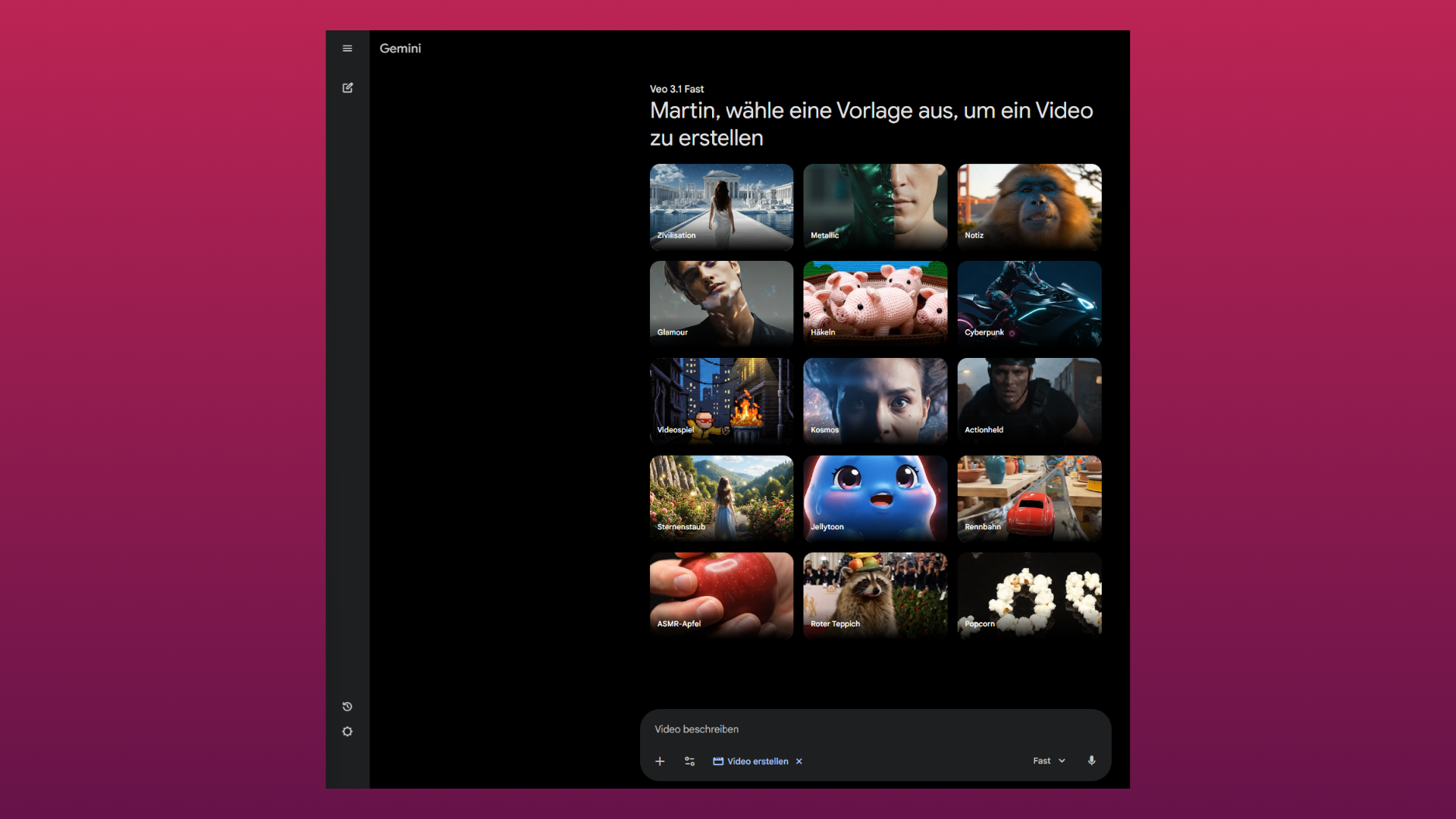 Die Template-Funktion steht in Gemini sowohl in der Webversion als auch in der App zur Verfügung. Nutzer:innen können aus verschiedenen Stilvorlagen wie Jellytoon, Crochet, Red Carpet, Racetrack, Action Hero, Cyberpunk, Memo, Glam oder Popcorn wählen. Anschließend lässt sich der gewählte Look mit einem individuellen Prompt weiter ausarbeiten. Zusätzlich können eigene Bilder hochgeladen und in die jeweilige Stilumgebung integriert werden.